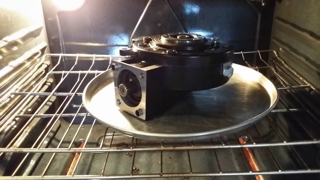 4. Heat final drive “neck” to 250 deg F with a heat gun. Alternately, I put the entire final drive assembly - affixed to the case holding plate - on an old pan in the oven at 325 deg for 45 minutes. I used an infrared thermometer and removed the drive when exterior temperature reading was 275 deg. Note photo below shows initial "oven bake" without case holding plate. On subsequent runs, I did include holding plate, too.