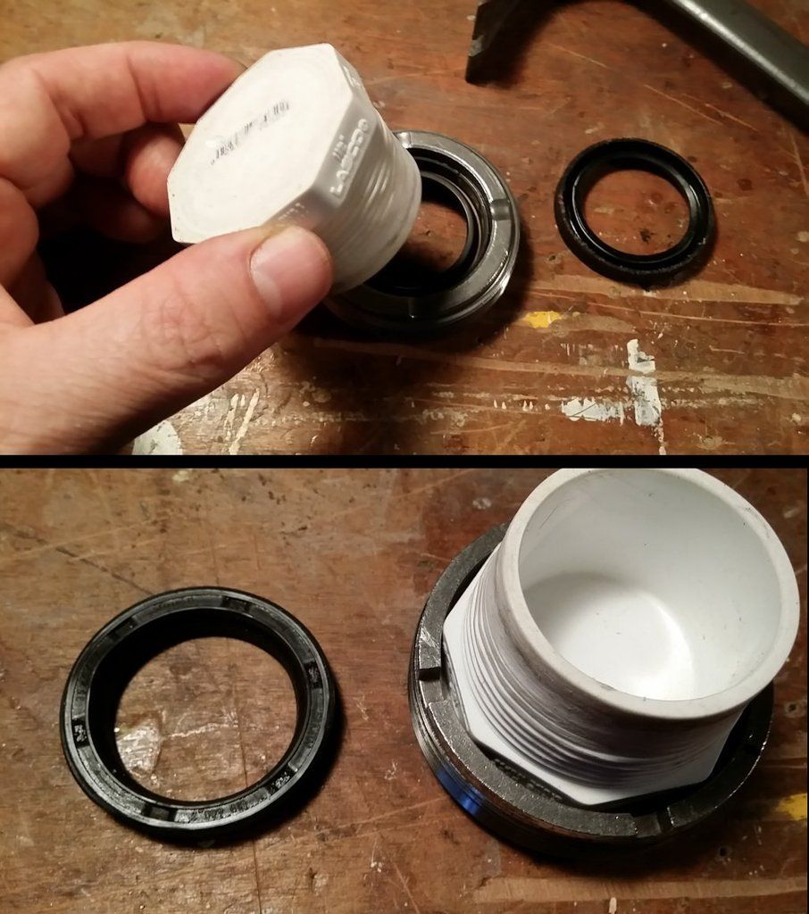6.Use 1-1/4" threaded PVC cap, 5" piece of wood and hammer to remove pinion gear oil seal from the threaded ring (notches down) (see top picture below). After cleaning threads, wipe a little final drive gear lube onto outside of new oil seal and inside of threaded ring. Next, set the new oil seal (lettering side up) into the threaded ring (notches up) using the 1-1/4" threaded PVC cap, 5" piece of wood and hammer. I used the flat part of the PVC cap facing down (see bottom picture below) so that cap would bottom out on the lip inside of threaded ring (the "lip" is best seen in freezer photo below). BUT… the lettering side of the new oil seal needs to be recessed another 0.11 to 0.13” beyond the lip. To do this you need to flip the PVC cap over and use the “threaded” end again. The oil seal is very tight at this point and this last step takes patience – you don’t want to drive it too deeply or set it out of square – you might damage the seal trying to correct this depth setting or lack of square-ness from the reverse side.