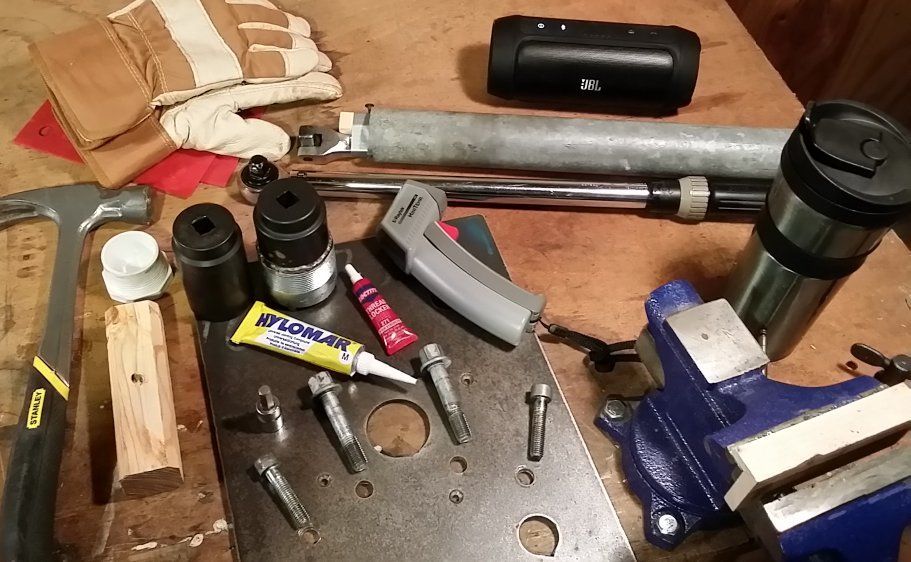 3. Use 36mm x 1/2" drive deep socket, breaker bar and “cheater” to break loose the hex nut surrounding the shaft splines. Note: this nut was previously set at 130-160 ft-lbs with red Loctite… don’t be shy about using a long cheater bar and a friend.