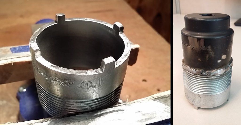 5.Use custom threaded ring removal tool, breaker bar and “cheater” to break loose the threaded ring.