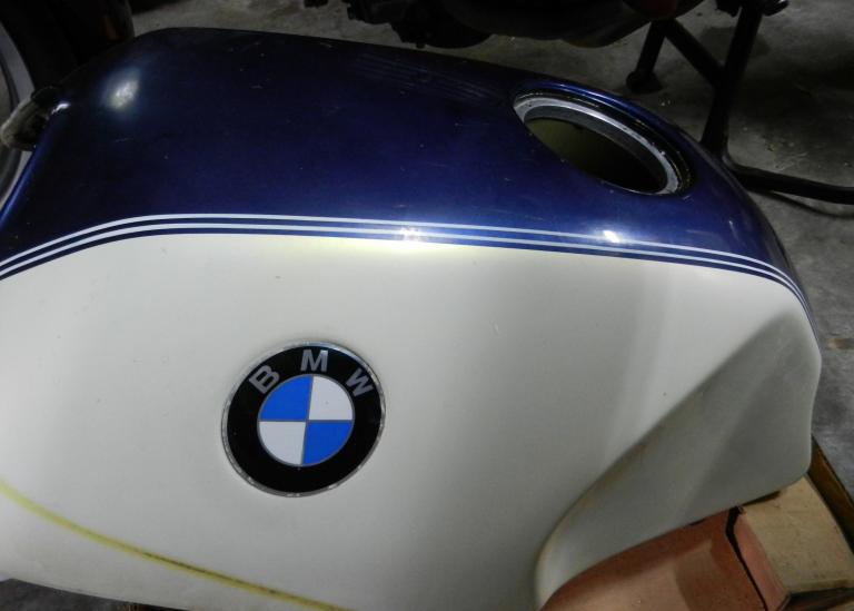 The bike is filthy, has a lot of sun damage to the paint and rubber bits. The tank has a good coating of varnish and Vegemite inside it, and the pump is toast. There are several missing parts, including the injectors, which judging from the tank probably weren't worth trying to save. The bike is spattered with overspray of unknown chemical composition that, so far, can be removed with denatured alcohol without damaging the factory paint which can probably be saved.