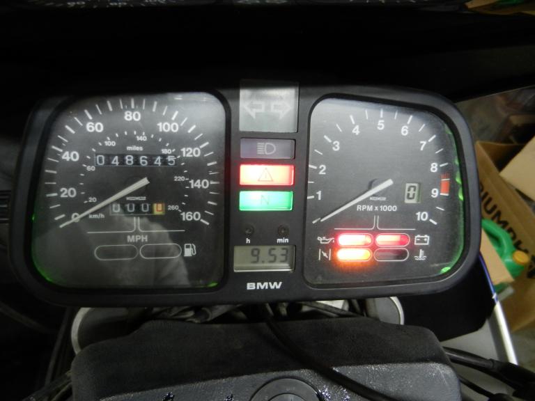 With the ability to turn on the ignition, I connected my jump box to the battery wires and set the clock in the instrument cluster. Holding my breath and watching closely for smoke, I turned the key and to my amazement the headlight and tail light came on! The gear shift indicator works and the idiot lights work in the cluster( a few of the illuminating bulbs are out). Brake light works, high and low beams, and the parking lights. Turn signals, horn and hazard flashers don't work, but looking at the relay box it appears some relays and the bulb monitor unit may be missing. I hit the starter button briefly, and the engine turns over! The harness looks to be in pretty good shape, better than I've seen on a previous bike, so I don't think it will need much to work properly.