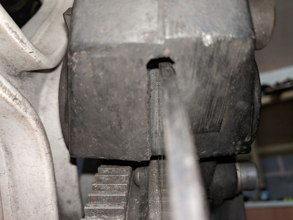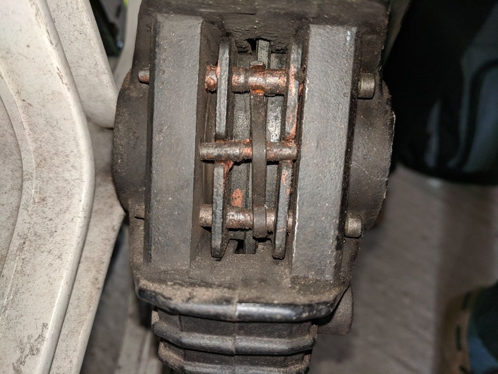 on the front, the right hand disc appears to have worn the pad away entirely and begun wearing a groove into the caliper itself. When stationary it appears that the disc is touching the caliper on the right hand side, which you can just about see in the below pictures