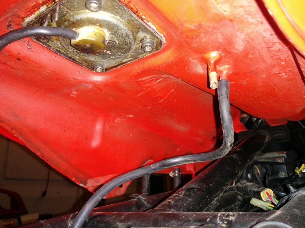 The tank has also been repainted once, albeit poorly. I'm not complaining, since it still looks good as a 20' bike. However, the bottom insulation was removed. I have since cut and added a reflective insulator underneath the tank. That will radiate heat/energy back downward, away form the gas tank. Boiling fuel should and positive pressure should be less of an issue now.