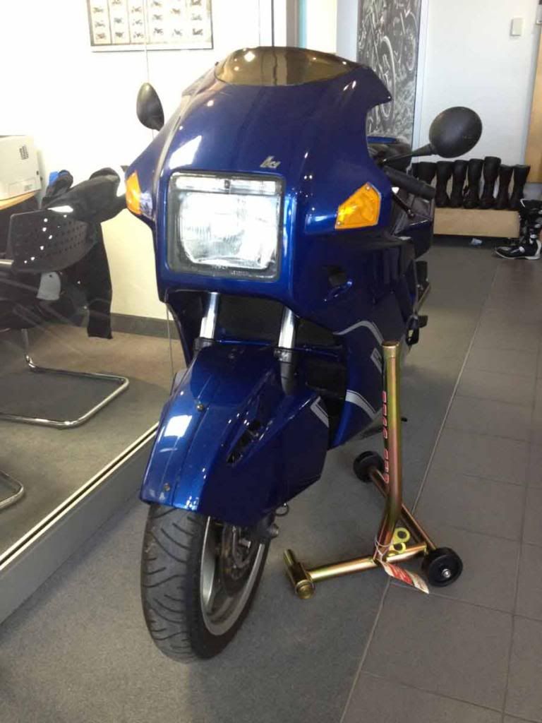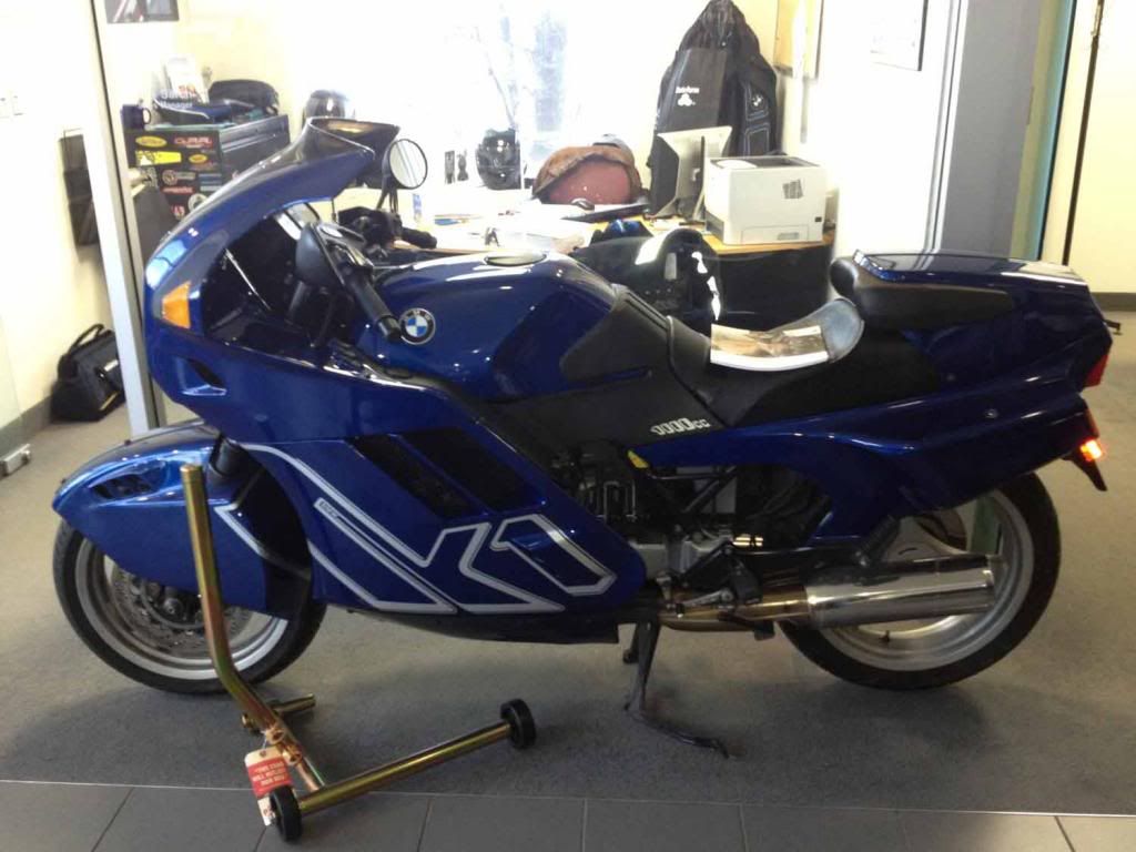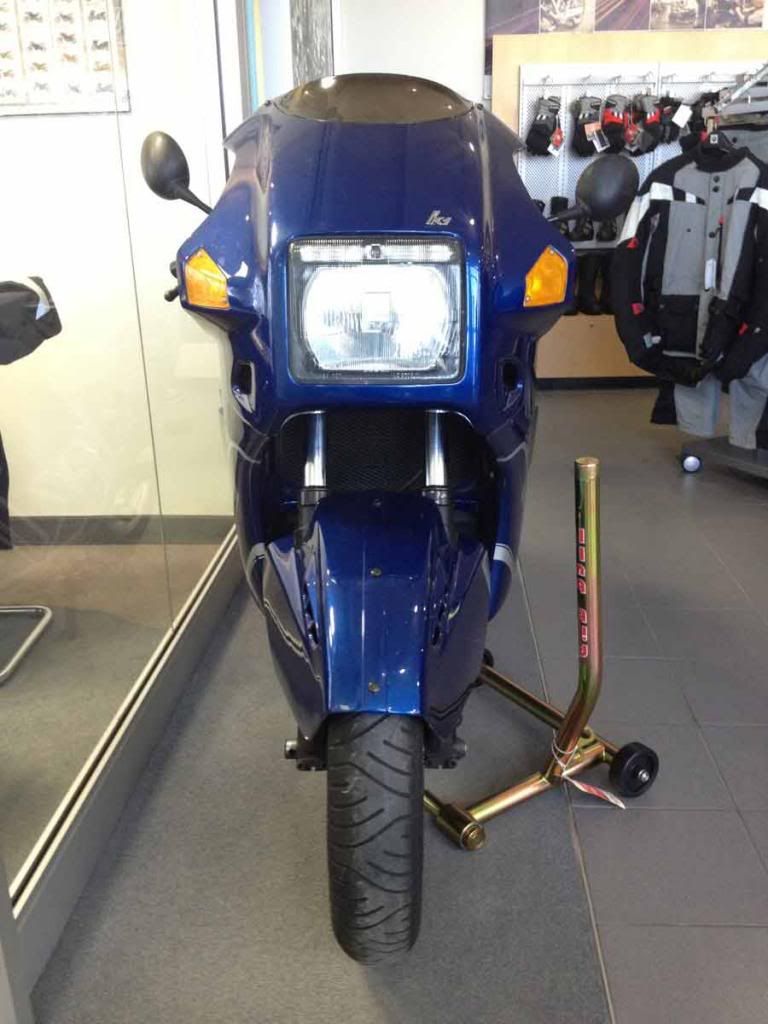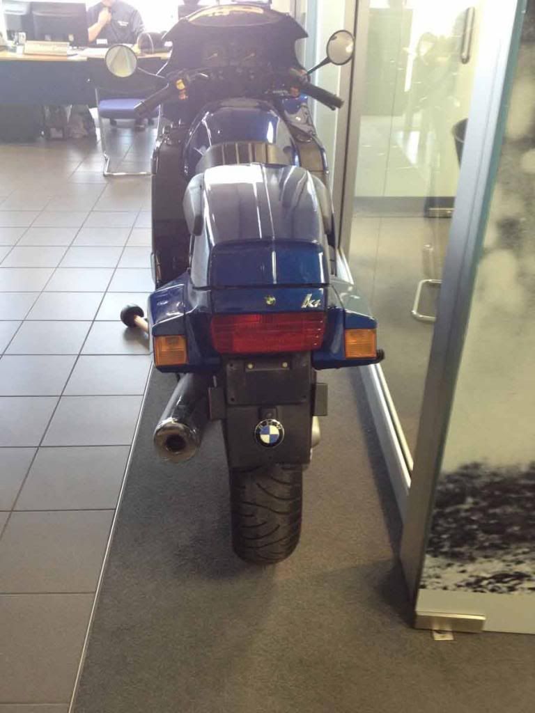 The K1 was parked in the BMW Motorrrad on consignment. Low miles. Well looked after. Owner wanted an arm and a leg for it. Nice show piece. Same color as my K100RS too so I snapped as many photos as I could, pictures forthcoming...