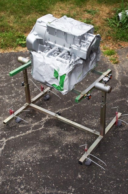 I setup a temporary spray booth from some scrap 1x2 lumber and vapour barrier plastic I had around the garage, stapling vapor barrier to the outside and installing a ventilation fan at the back. I laid plastic on the floor of the garage to prevent overspray from ruining the tiles.  I completely dismantled the components from the engine block and spent quite some time cleaning, degreasing and masking the engine.  I cleaned the engine block using a drill and a variety of brass wire wheels along with plenty of WD-40 to take off the engine grime.  I then used Wax and Oil Remover to degrease the block, prior to laying down the finish coat.  Once that time-consuming work was done, I set the engine block (on the movable carrier) in the spray booth and proceeded to give it several coats of the DupliColor silver engine paint.  I skipped a primer coat (as advised by others) and went straight to the Duplicolor.  I laid down 24 light coats and "baked" after each session by setting the engine out in the hot summer sun for several hours.