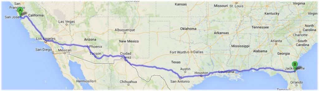 Done. Well actually a 43 hour and 46 minute CC to be exact. 2803 miles from Santa Cruz, California to Jacksonville, Florida.