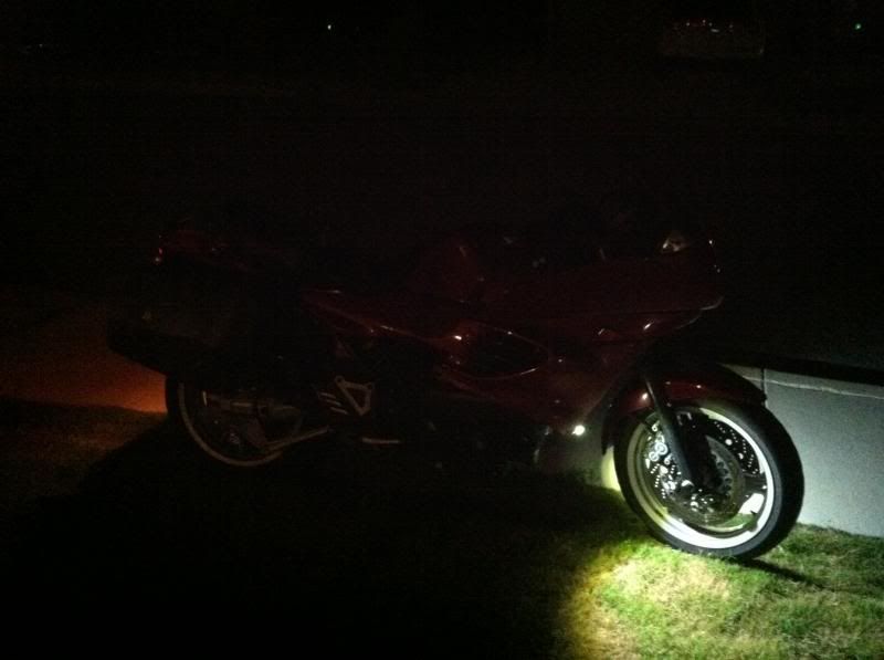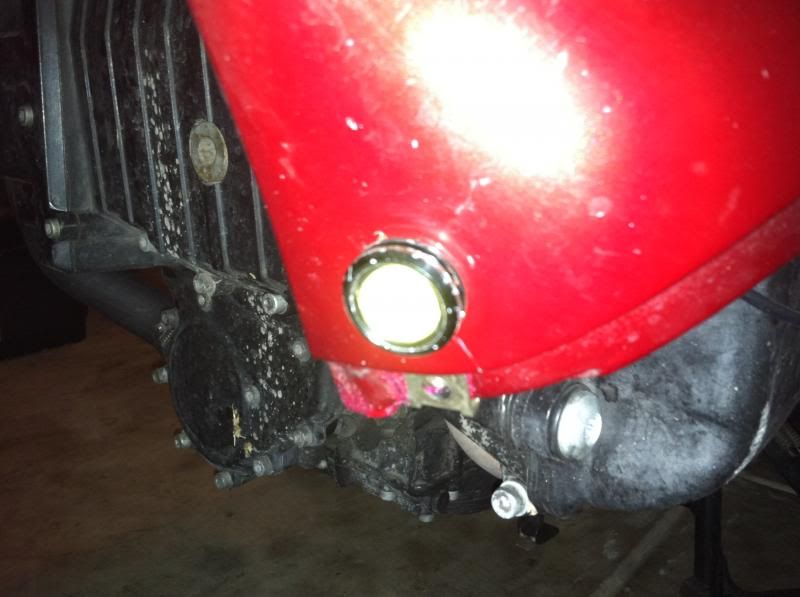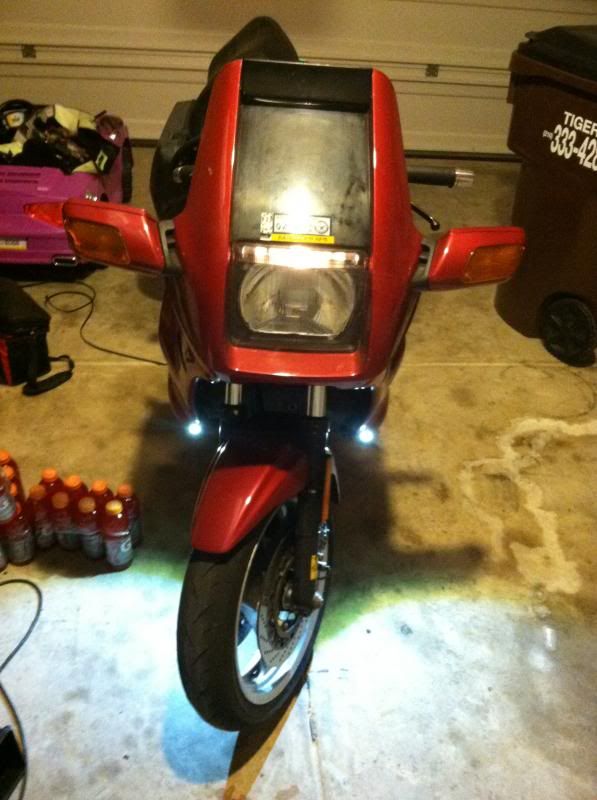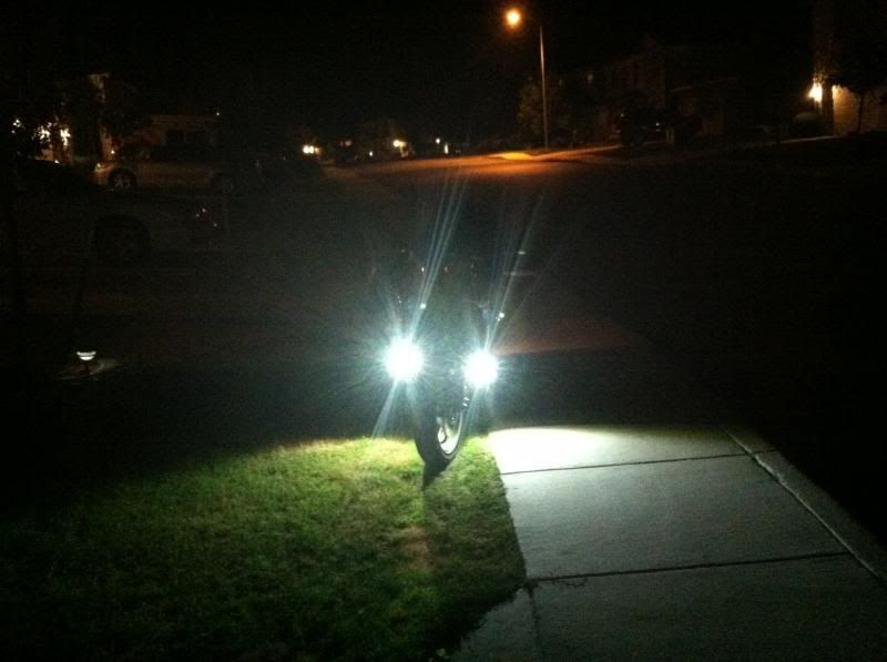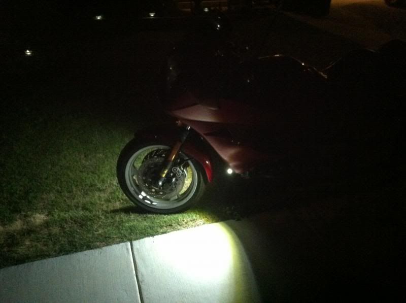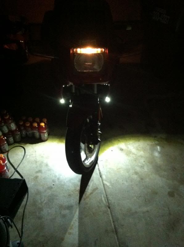 I've bought 3 pairs of those same lights. I was going to wire 1 set into my low beam, and 2 into the high. I'm still debating on placement, I do like how yours light up the ground off to the sides, does that help with critter sightings? I opted to do away with my stock mirrors and turn signals for a pair of GSX mirrors with built in LEDs, and was thinking of mounting a pair in the fairing where the old mirrors were. And then cutting bezels out of 1/2" PVC and mounting a pair on the front of the reflectors for a clean unobtrusive look.  :yes