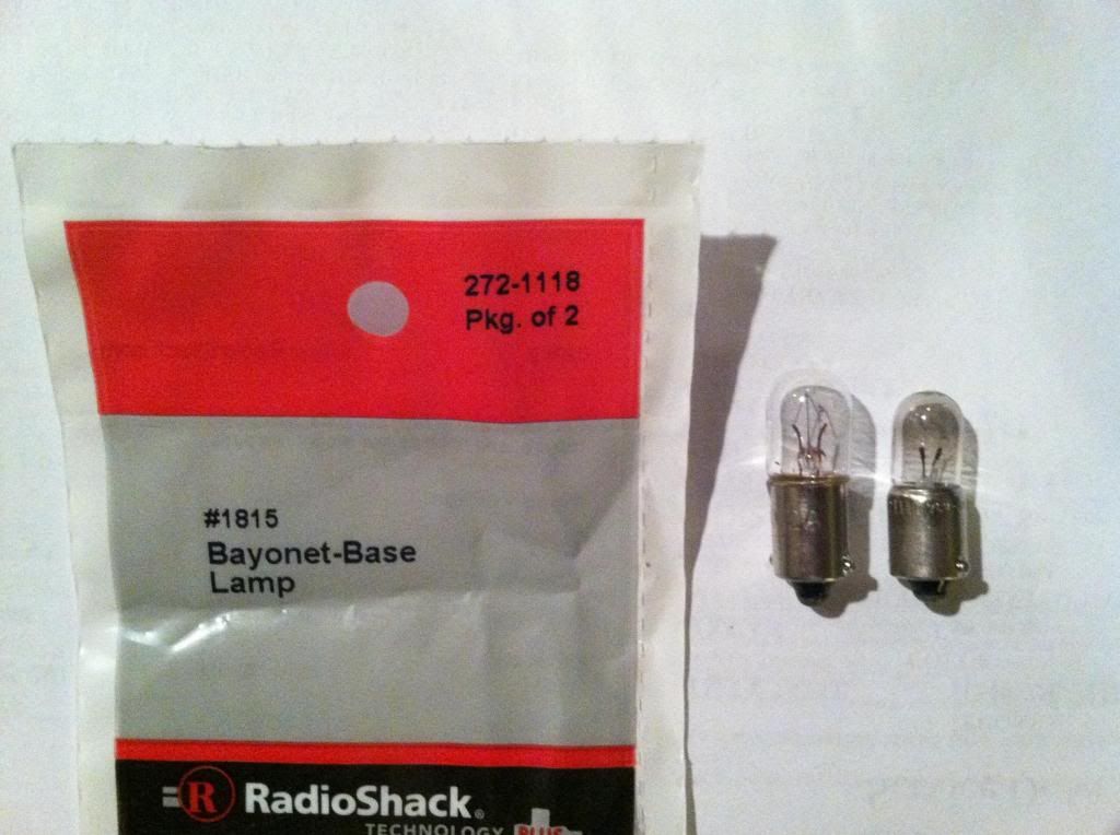 If yours burned out, like mine did, Radio Shack sells a cheap replacement.  The Radio Shack bulb is rated for 14V & 200mA - the factory bulb is 12V & 330mA (4W).  It comes in a two-pack and is only $2.49.  The new bulb is on the left, the old on the right.  The new bulb is slightly longer, but it fits perfectly.