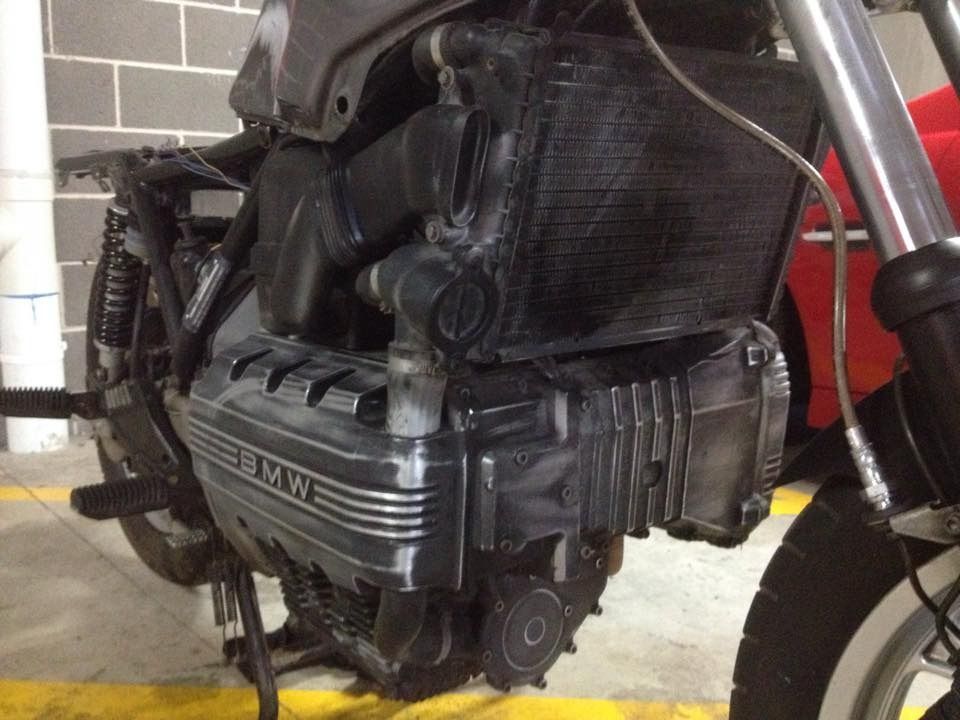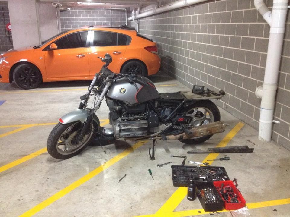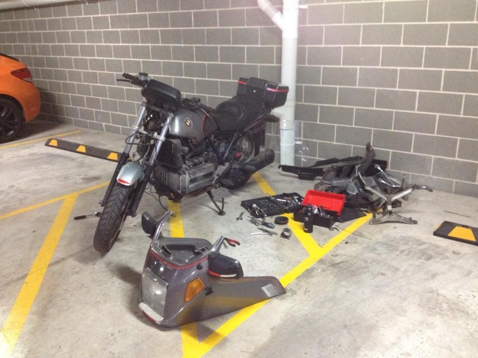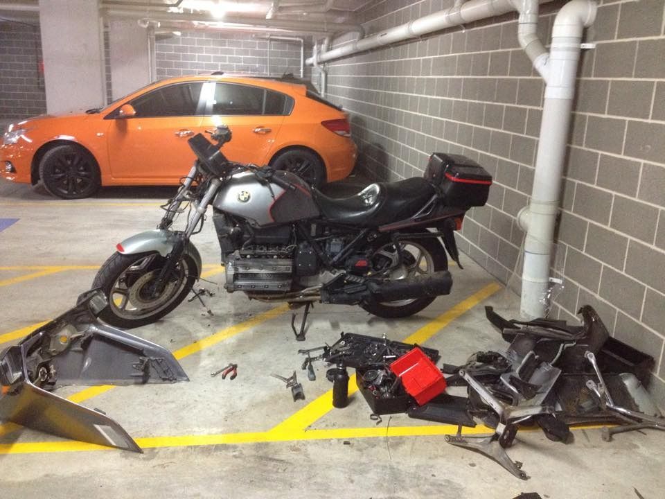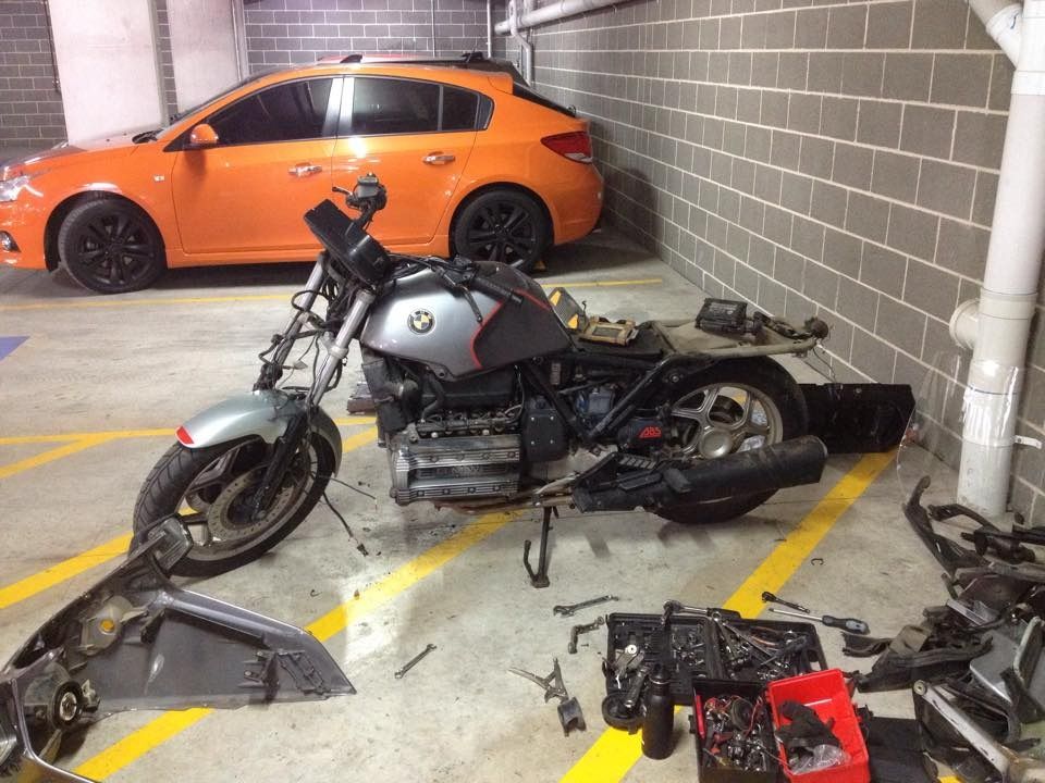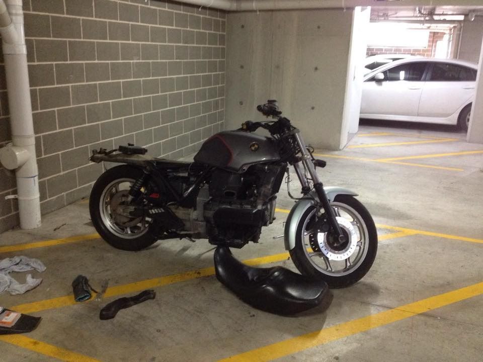 What's good PARTY people? I've been looking to get a K100 or K75 for years and one just popped up the other day for pennies so I got it and got started on it. She's a '91 K100LT 233,xxx kms on her. Seems to run nicely so I have done full service on her and stripped her down to tidy her back up. Goal is to make a nice looking simple bike that I can do some long distance surf trips on. Last add will be a surf rack. It's been 1 week since I got the bike and not too much left for the first phase of this build (phase 1 being to get her into mechanically sound and aesthetically pleasing condition).