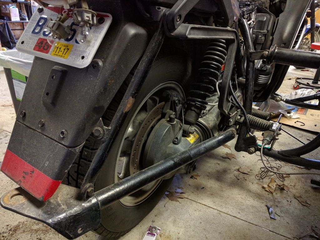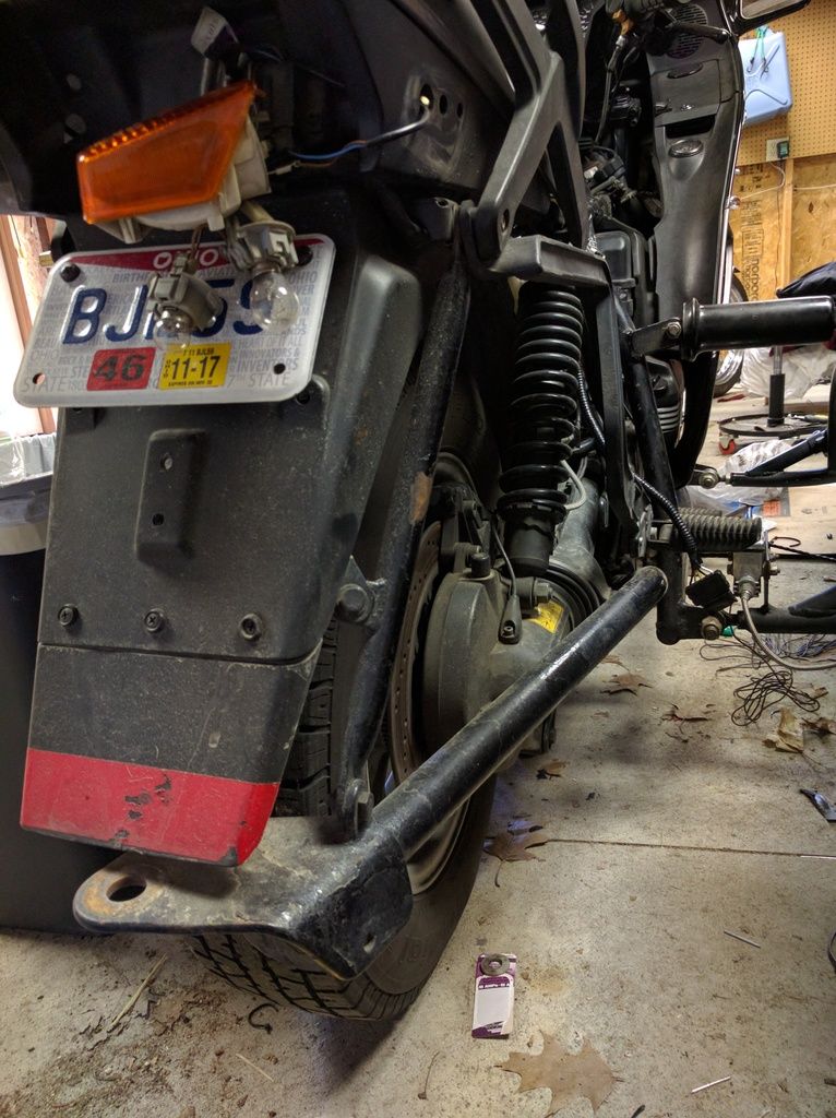 2. Where does the bracket go that is up behind the rear fender? About half way up is a bolt that looks to attach to something else.