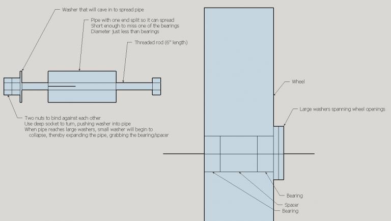 Here's what i actually used. The top bolt was actually reversed, with the head on small washer side, which I drove in using a deep socket. I didn't have threaded rod so I used two different size bolts. It would have been a lot easier with the right length threaded rod. You can see that small washer caved in once the pipe bottoms out on the larger washers. This helps it spread the pipe out, giving good grip on the bearing. I ended up using 3/8" bolts with 3/8" washers, which were almost perfectly sized for the bearings.