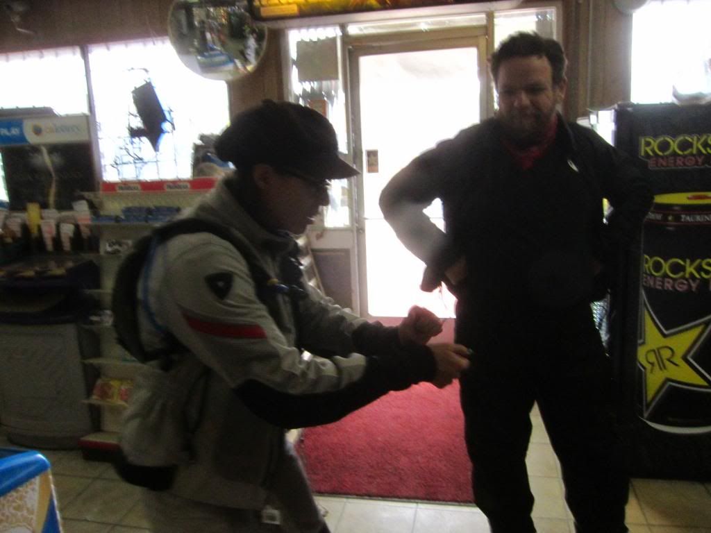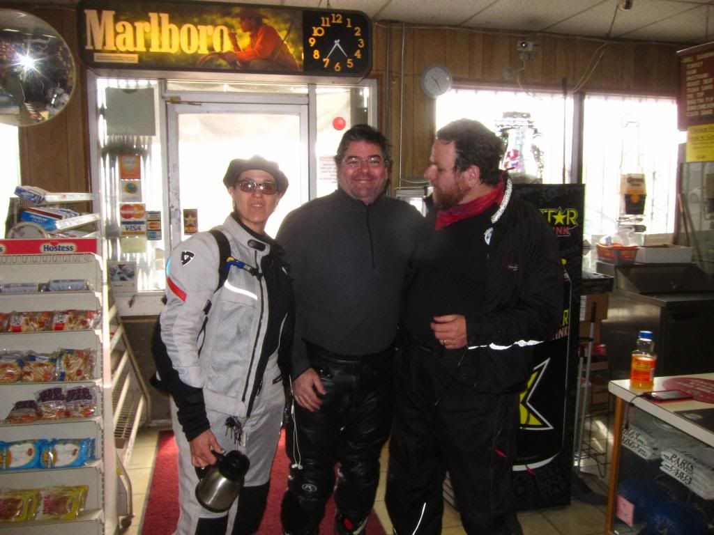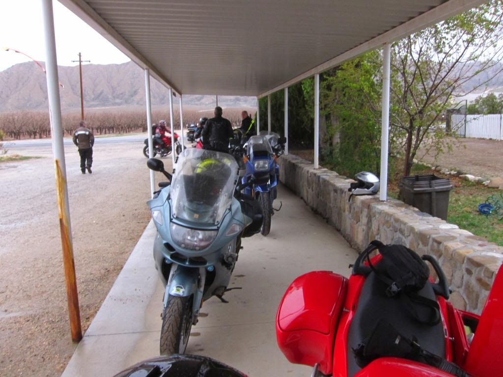 We sought refuge under the covered motorcycle parking at the Pistachio Store in Ventucopa and tried to dry and thaw out before venturing further.