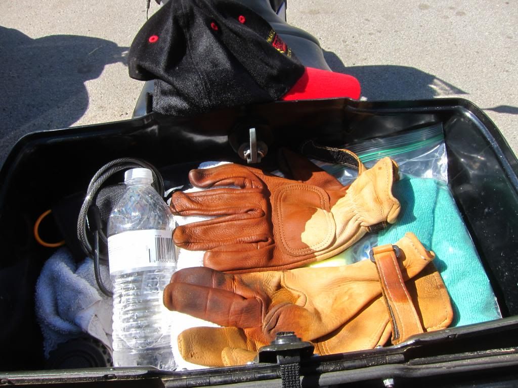Reminder and note to self: Winco water bottles are a LOT thinner than anyone else’s, they puncture easily, and DON’T leave your deerskin gloves in the top box anymore – put them in the tank bag where they belong.
