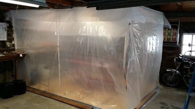 Tent consists of:  (3) 4x8' sheets of 1" rigid blue insulation (floor) + (3) 4x8' sheets of OSB / oriented strand board (floor) + 75' of 10' wide x 4 mil plastic sheeting (walls & ceiling) + 100 sq ft of R13 batt insulation (ceiling).  (2) 48" x two-bulb flourescent light fixtures provide the illumination.  (2) 1500 watt space heaters do the heating.  With this setup, I've warmed the tent to 65 deg F on a 10 deg morning.