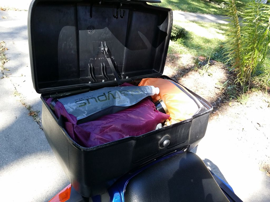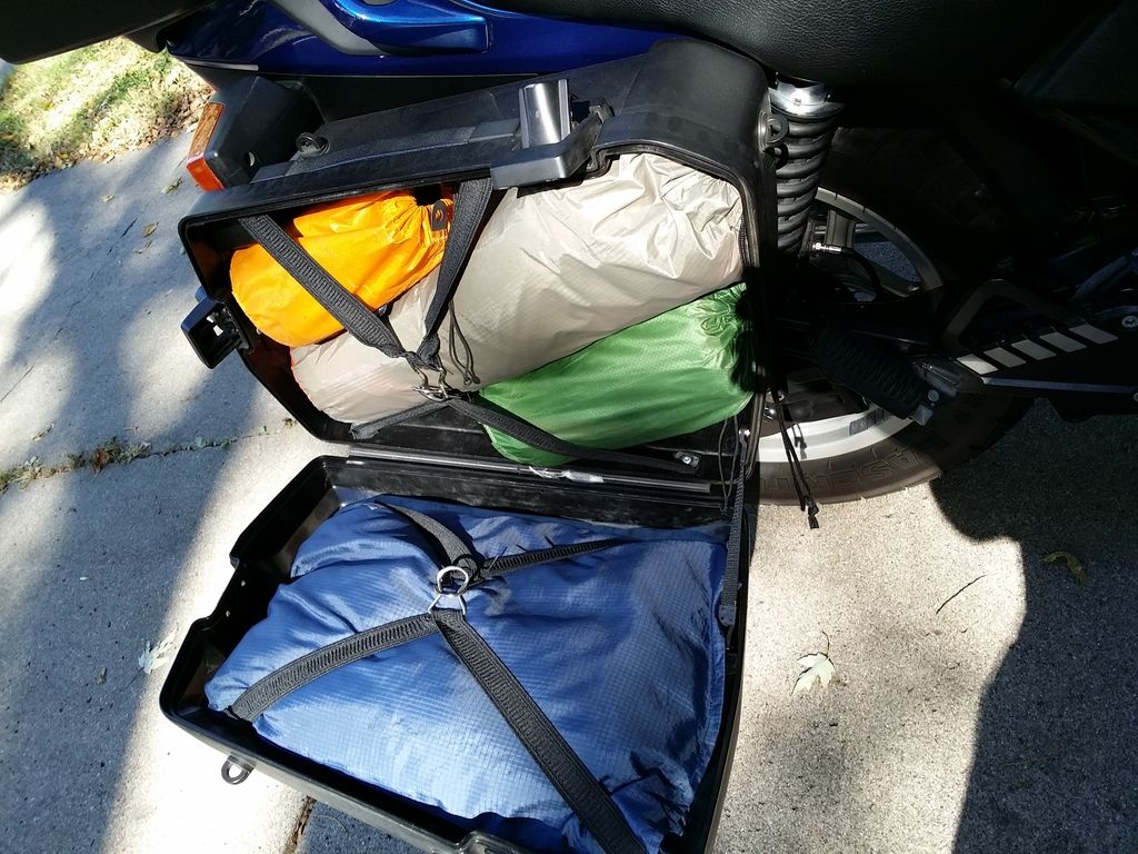 Right case:  stove (yellow);  tent (grey);  sleeping pad (green);  pillow (blue)