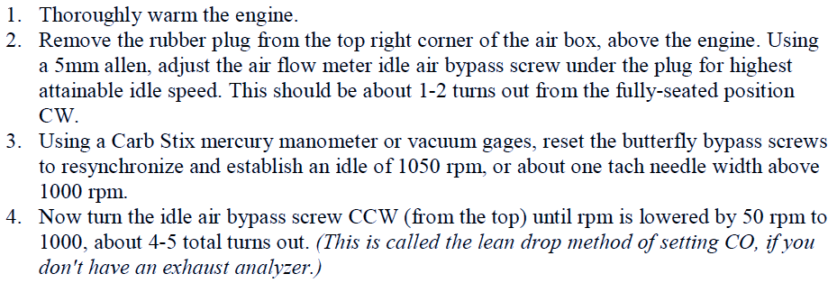 actually, those instructions are perfect and the standard way to tune the FI.  the instructions say butterfly BYPASS SCREWS.  not the other verboten adjusters.  the last step is as Liatch describes.  leans out the mixture just a touch.  50 rpm ain't much, but enough to get the AFR close without use of WBO2 sensor.