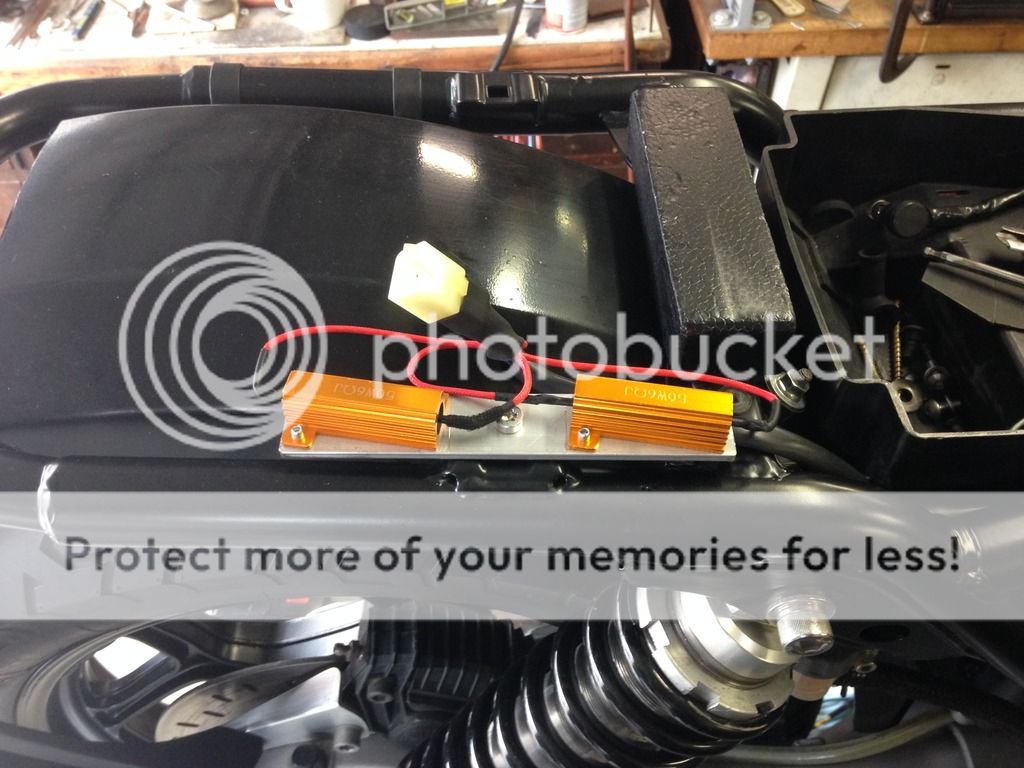 The only change made to the frame is the 5" section that was cut out of seat frame between the rearmost cross brace and the original seat mounts which are not being used. Except the right one. It's holding the mounting bracket for the turn signal resistors.