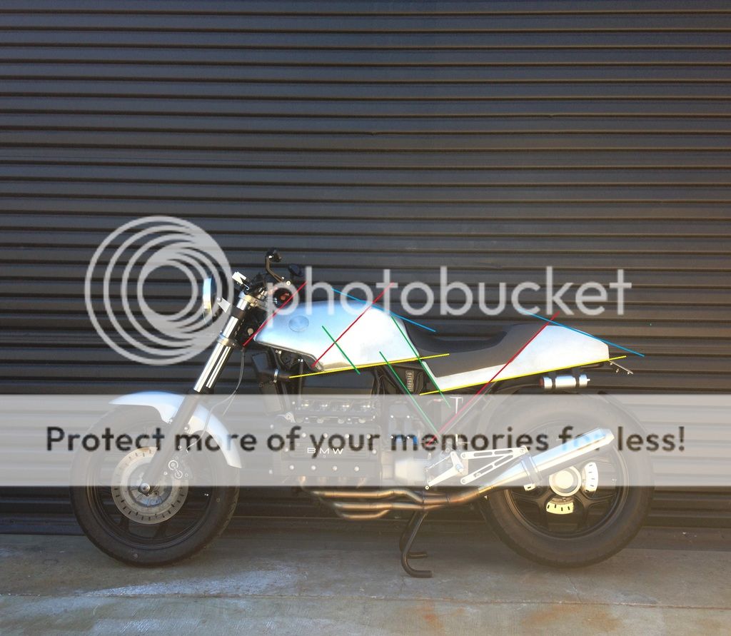 And that the rear of the tank meet with the front of the seat and cowl, as seen by the green lines. It just so happened that they also parallel the frame tube and the front 'knee dent' line on the tank.
